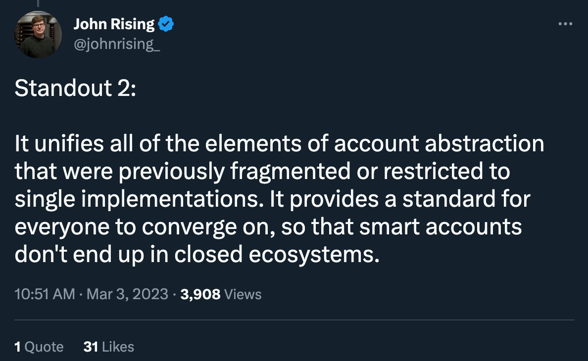 Furthermore, if I had to guess, there are going to be a lot of wallet-specific use cases. Some wallets will be dedicated to one user group like parents, gamers, or traders, and will have accompanying AA features to serve those typical needs best.